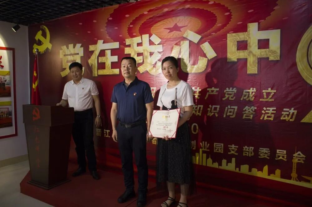 陈埭镇企业党委副书记蔡建明作总结讲话:在纪念中国共产党成立99周年来临之际,组织开展“党在我心中”党建知识答题活动,重温中国共产党的光辉历史。加强对党史知识的宣传,不忘党史,坚定理想信念。蔡副书记还充分肯定了园区董事总经理陈建恩对支部工作的大力支持。