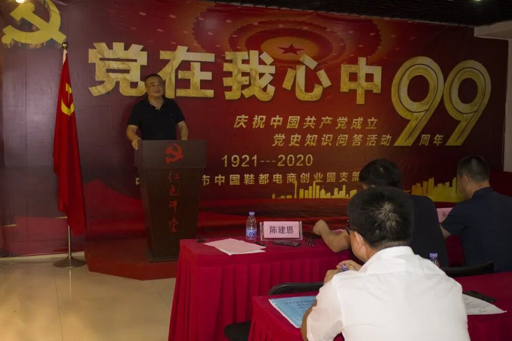 2020年6月29日,为纪念中国共产党成立99周年。中国鞋都电商创业园党支部委员会(党建带团建、党建带工建)开展“党在我心中”党史知识竞赛活动。重温中国共产党光辉历程,深情回顾党的奋斗精神,讴歌党的光辉业绩,激发广大党员、团员、工会成员的历史责任感和使命感,具有深远意义。市委组织员、非公企业和社会组织同业党建联盟指导员张远华、陈埭镇企业党委专职副书记蔡建明、同业党建联盟联络员陈宝玲、园区董事总经理陈建恩、中国鞋都电商创业园党支部书记张文辉一同参加。